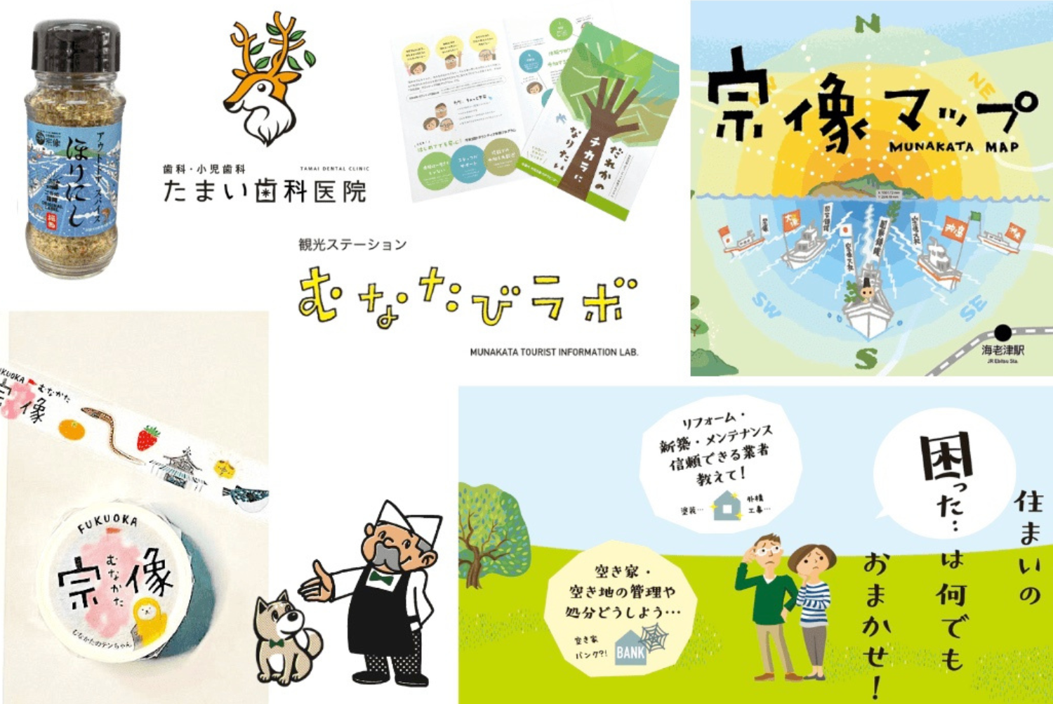 まちの観光マップ、認知症相談のチラシ、住マイむなかたや六七商店のイラストなどなど…