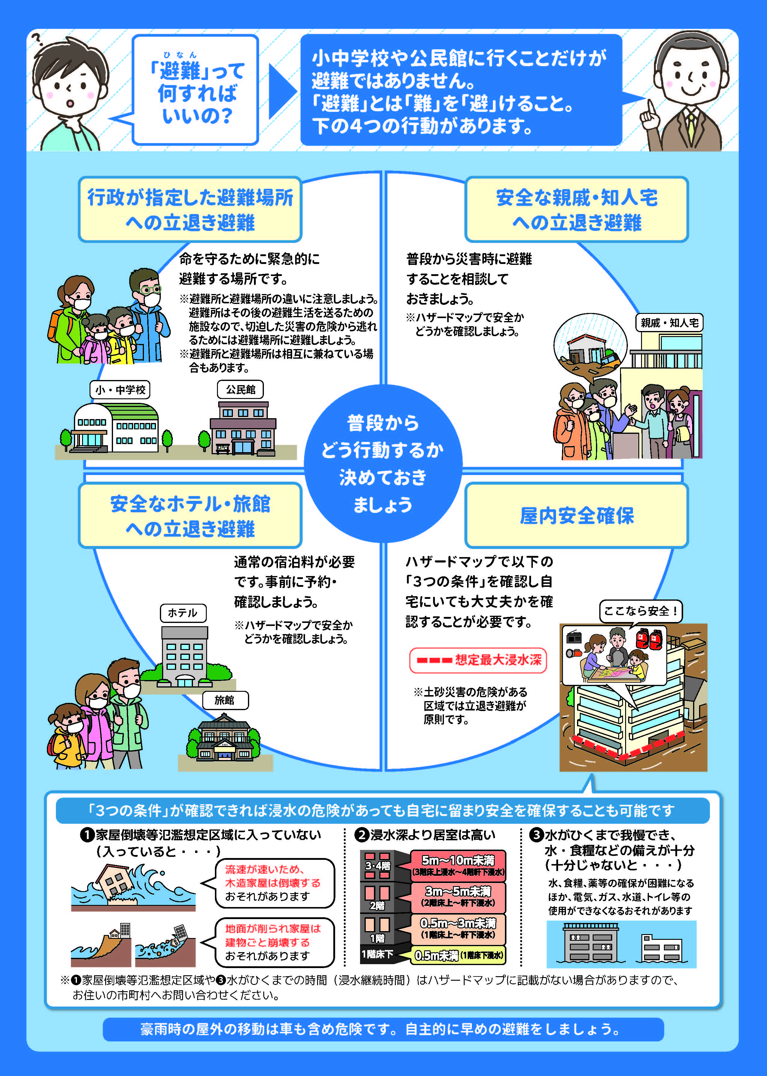 避難には、安全な親戚の家や民間のホテルなどに身を寄せる避難や、自宅の安全を確認して過ごす「在宅避難」など、さまざまな方法があります。一つの方法にこだわらず、緊急避難場所をあらかじめ考えておくことが大切です。