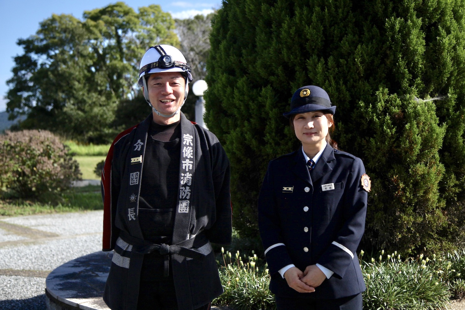 宗像市消防団には、10代から70代まで幅広い世代が所属しています。仕事や子育てと両立しながら、「地域を守りたい」という想いで活動を続ける団員たち。今回は、在団23年のベテラン分団長・清水陽介さんと、子育てをしながら女性班で活躍する壹岐祥子さんに、消防団のリアルを語っていただきました。