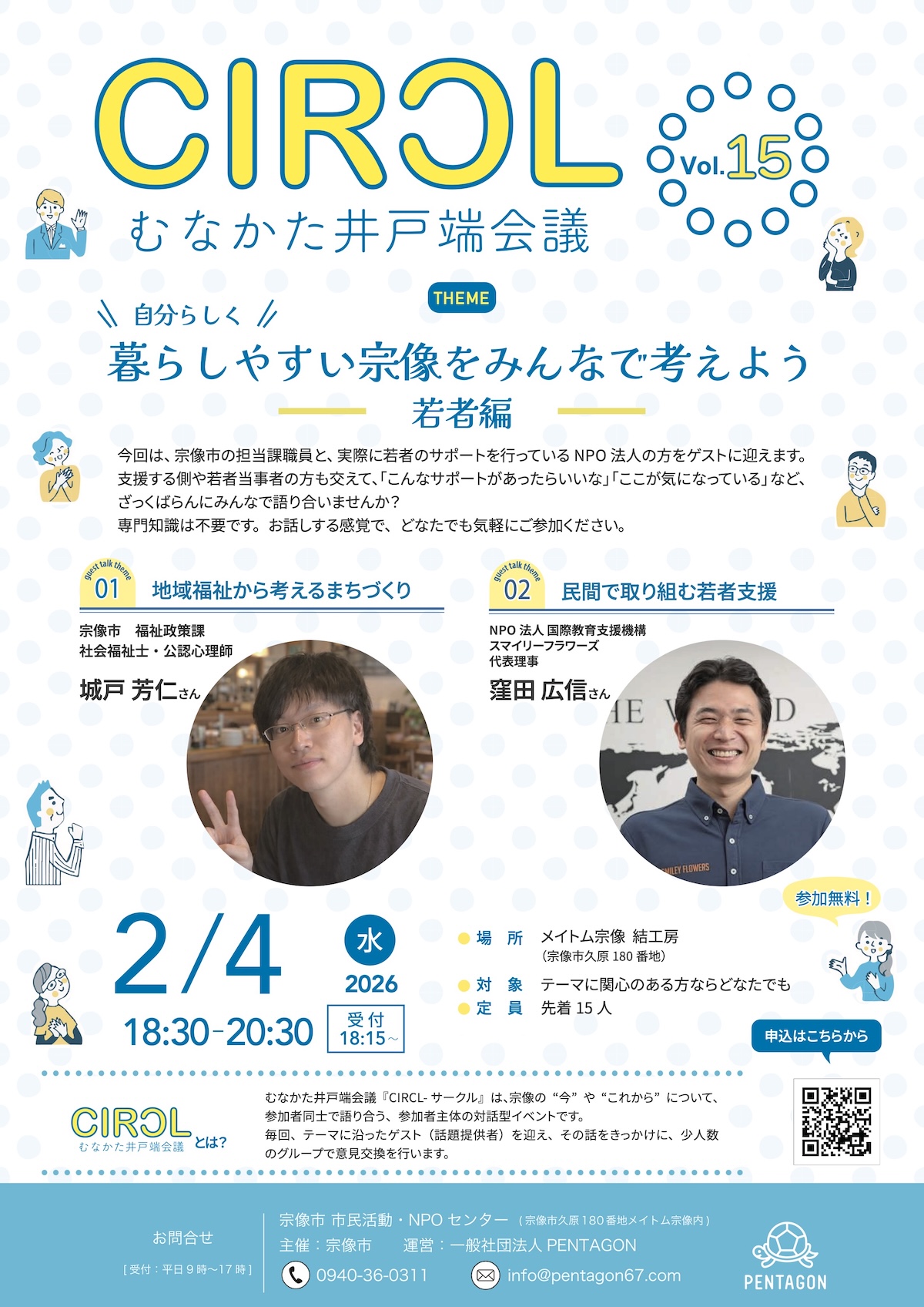 むなかた井戸端会議『CIRCL-サークル』 は、宗像の“今”や“これから”について対話を通じ、考えを巡らせながら深め、明日への行動につなげることを目的とした 現代版井戸端会議 です。